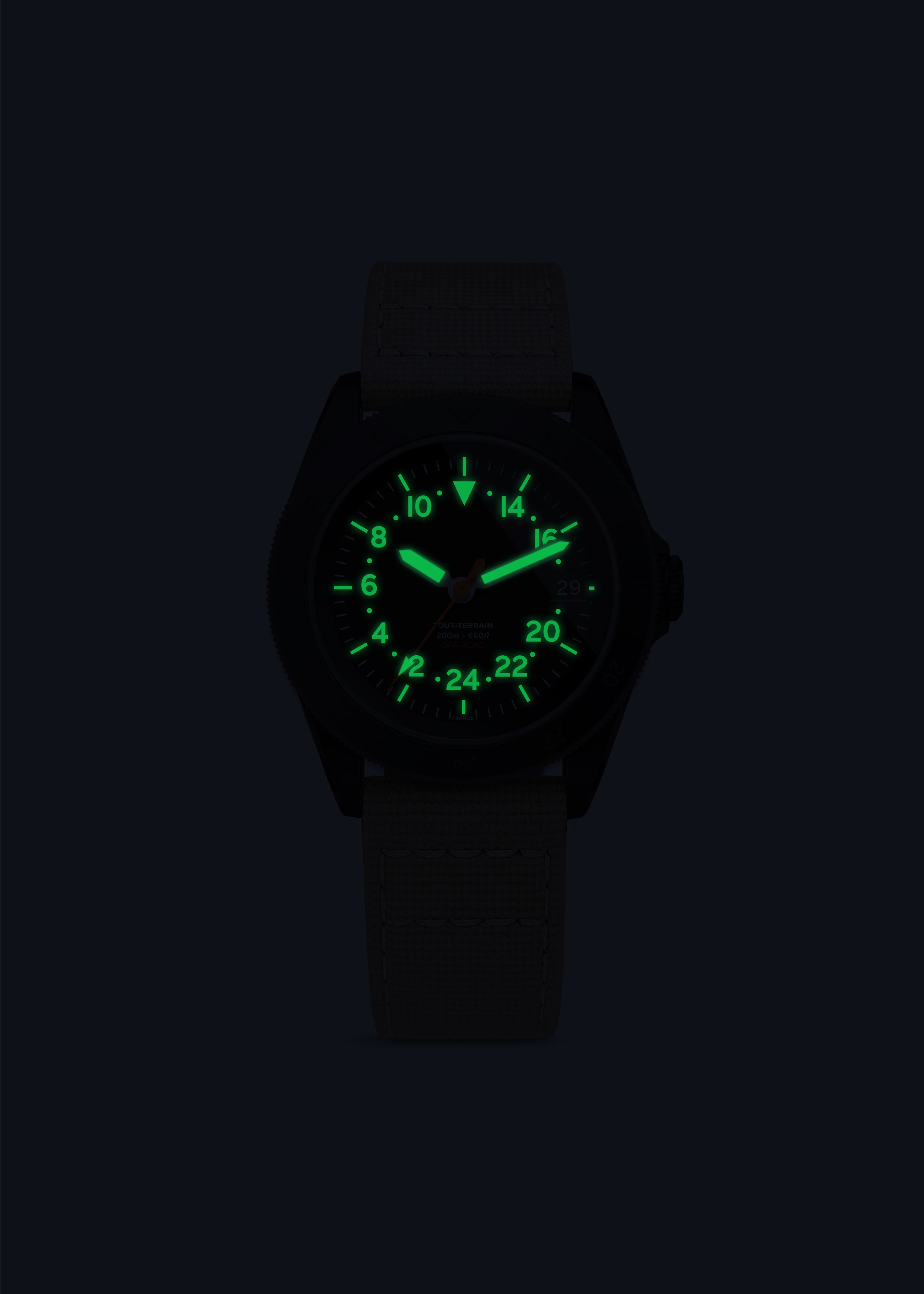 The ALL-TERRAIN GR20 Corsica , in full black, is the watch at the heart of a collaboration with the 13th Parachute Dragon Regiment, special forces of the French army. The ultimate explorer, it is discreet with its deep black. Ultra robust. It was tested in conditions during the GR20 in Corsica, and has kept this name ever since.